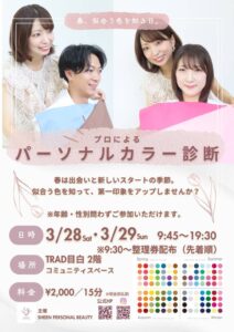 3/28(土)3/29(日)にTRAD目白2階コミュニティスペースにて、パーソナルカラー診断イベントを行います。